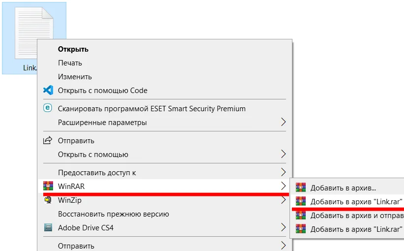 Самым первым действием станет создание архива из текстового файла. Для этого необходимо нажать правой кнопкой мыши на самом файле и в появившемся контекстном меню выбрать: WinRAR > Добавить в архив название_файла.