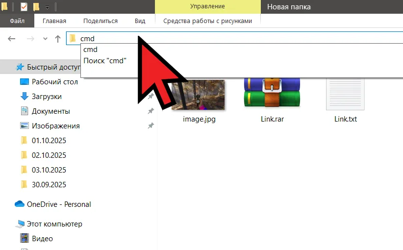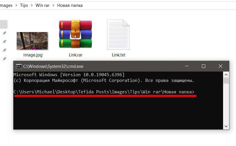 После этих действий откроется командная строка с текущим навигационным положением “Новая папка”.